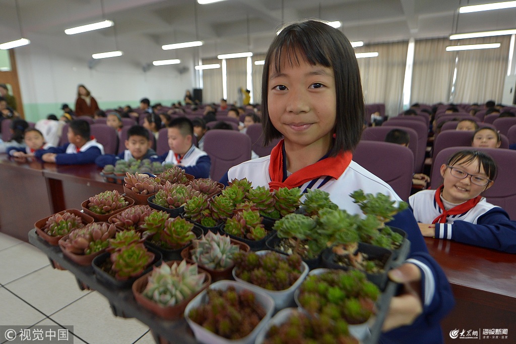 2019年3月12日,一名青島立新小學(xué)的學(xué)生展示在植樹節(jié)“書香換花香”活動中收到的綠植。