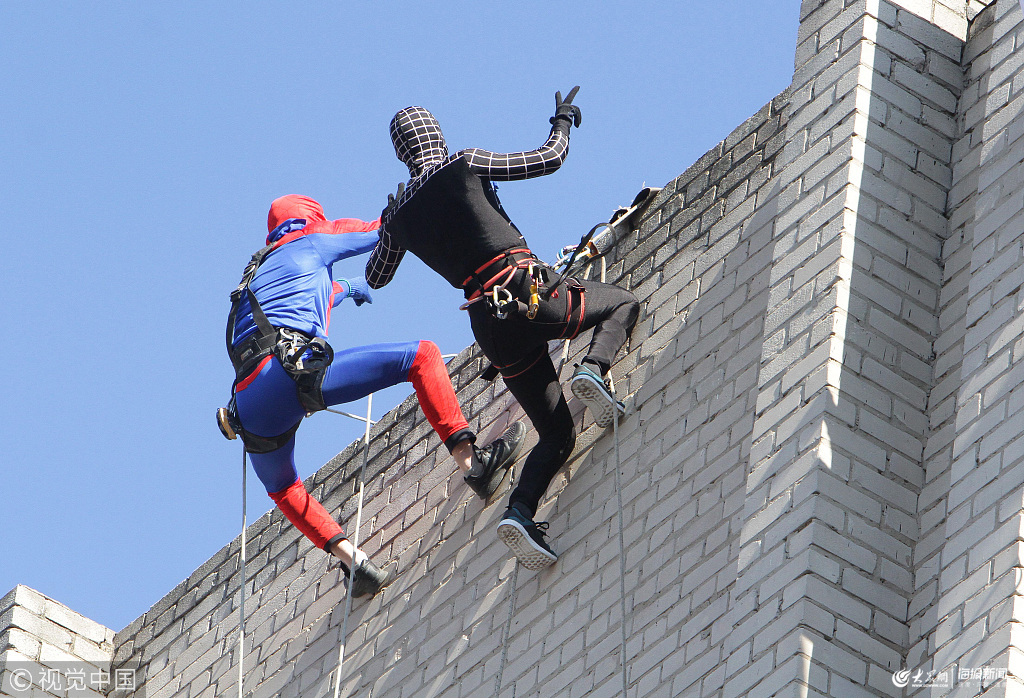 當(dāng)?shù)貢r間2019年3月6日,烏克蘭第聶伯羅,工人裝扮成超級英雄,在兒童醫(yī)院的天臺上從天而降透過窗戶逗樂病童們。