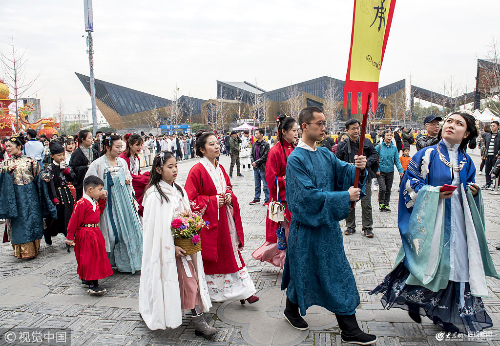 2019年3月16日,武漢,漢口里舉辦了為期一周的花朝節(jié),幾百位身著傳統(tǒng)漢服和民族服飾的人們?cè)诨ǔ?jié)上或走秀,或表演傳統(tǒng)節(jié)目,引得近萬市民前往觀賞和游玩。