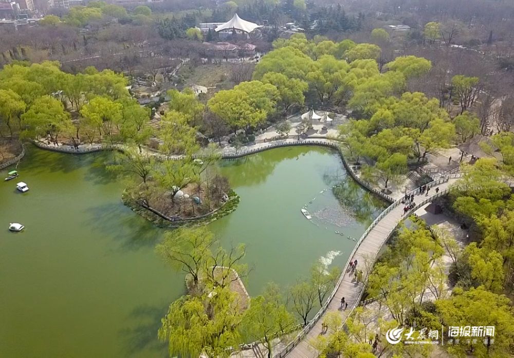 在濟南泉城公園,從空中俯瞰,一片片嫩綠環(huán)繞在湖岸,許多市民與游客行走在這一幕春意之中。不少春花競相盛開在路旁,滿園春色吸引了市民游客的目光,人們紛紛拿出手機打卡拍照,感受這一幕春暖花開。