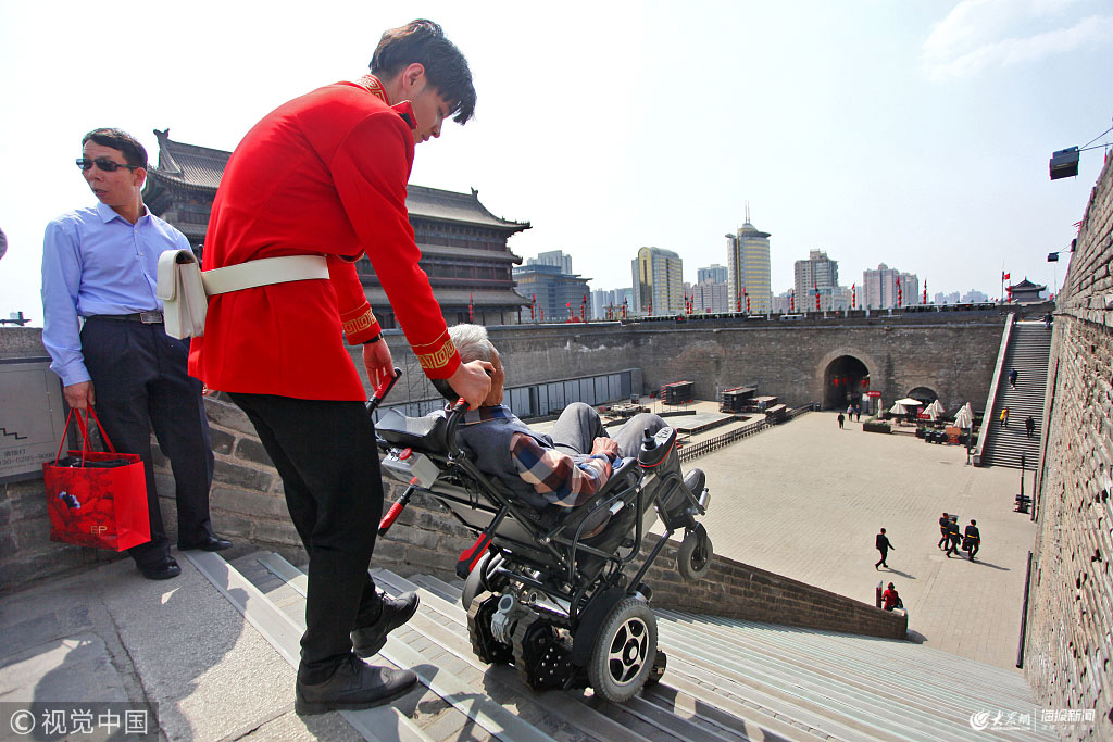 為了方便老年人和腿腳不便的游客,西安城墻南門(mén)入口專門(mén)配備了一臺(tái)“爬樓機(jī)”,幫助游客上下臺(tái)階,引來(lái)不少游客點(diǎn)贊。3月20日,在西安城墻南門(mén)登城處,來(lái)自黑龍江84歲張大爺就體驗(yàn)了一把“爬樓機(jī)”,因?yàn)椴挥脼榕罉翘莘鸽y,張大爺輕松登上視野開(kāi)闊的古城墻,眺望遠(yuǎn)處的美景老人心情特別舒展。