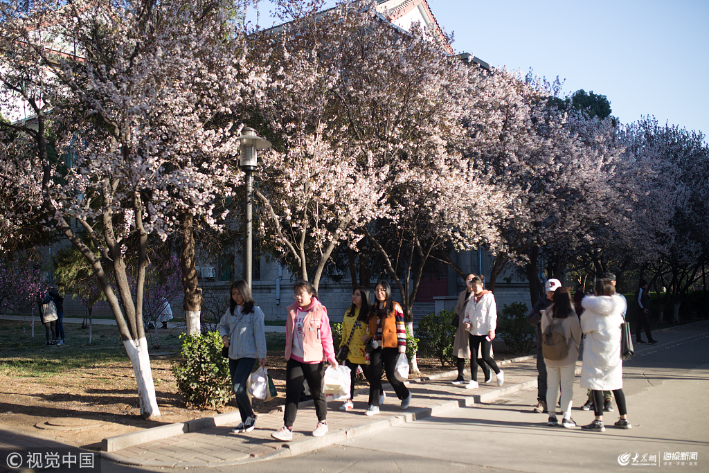 2019年3月23日,位于濟(jì)南的山東師范大學(xué)校園內(nèi),季葉李、美人梅等植物盛開,將校園的馬路裝扮一新,學(xué)生上課如通穿越畫中。