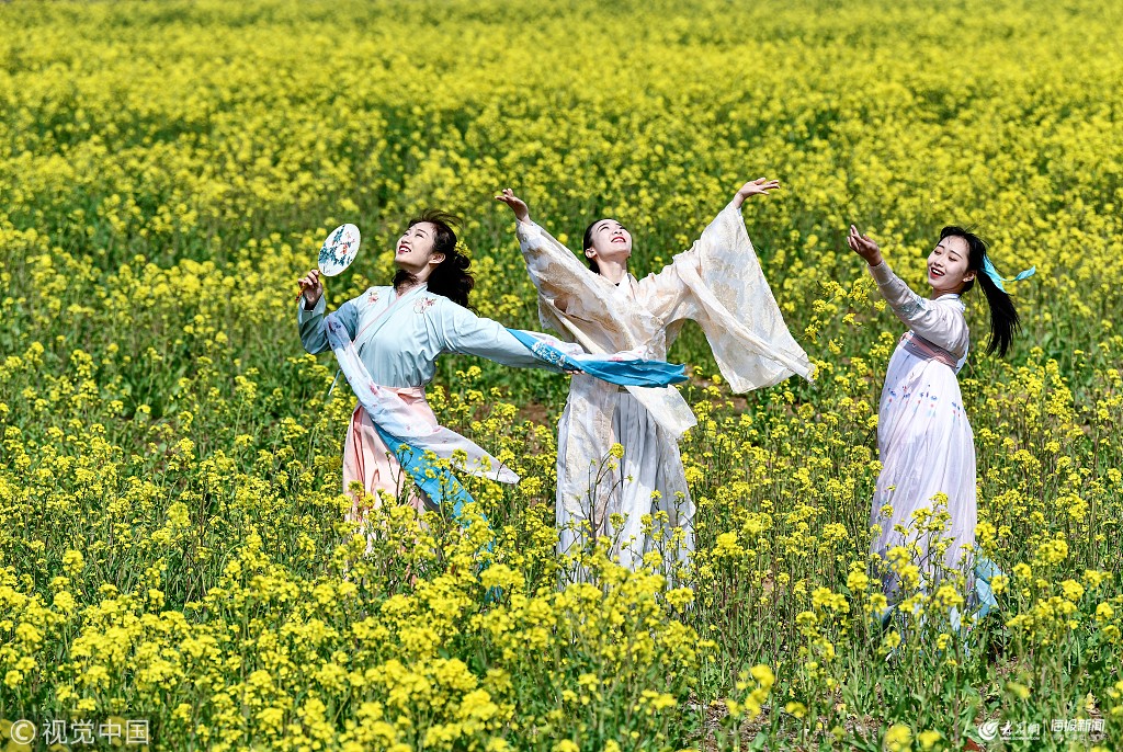 2019年3月24日,身穿漢服的女孩在山東省棗莊市臺兒莊古城景區(qū)油菜花海踏春賞花。