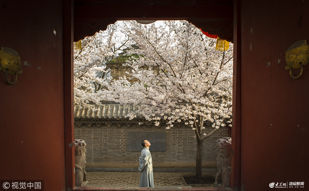 2019年3月28日下午,河南登封嵩山少林寺院內(nèi),幾株櫻花相繼開放,煞是好看,引得寺院內(nèi)的僧人紛紛前來圍觀。有的樹下悠閑讀書,有的即興習(xí)武,有的擺Pose拍照。