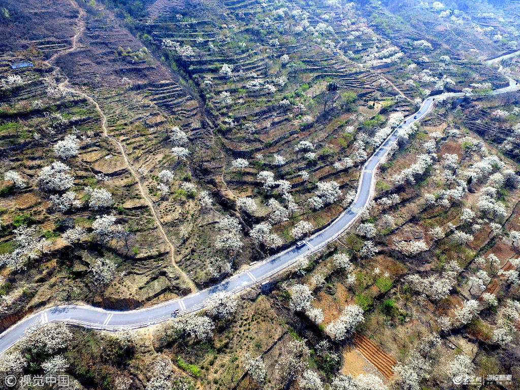 2019年4月3日,山東臨沂,平邑縣桃峪村千畝梯田梨花盛開。