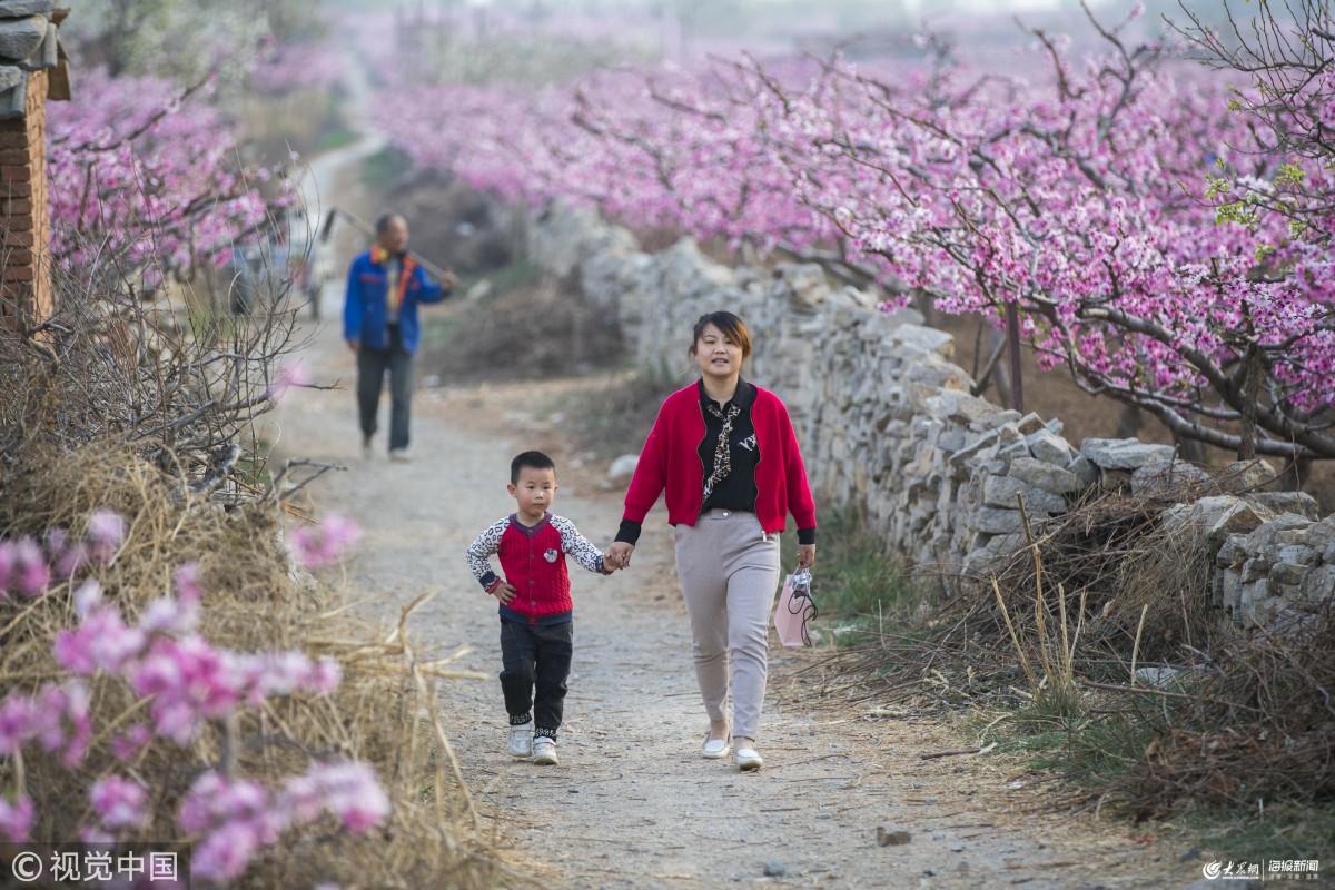 濟(jì)南,仲宮鎮(zhèn)東泉瀘村萬畝桃花盛開,當(dāng)?shù)卮迕窈陀稳酸溽嘣诜奂t色的絢爛花海中。近日,濟(jì)南南部山區(qū)附近迎來盛花期,民眾踏春賞花,盡享無限春光。