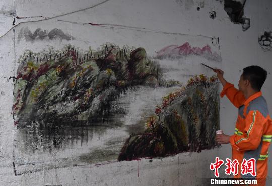 圖為重慶一名環(huán)衛(wèi)工人在鏟掉“牛皮癬”的墻壁上作畫美化環(huán)境!≈芤恪z