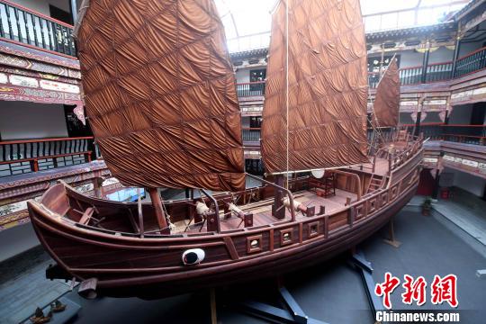 圖為博物館內(nèi)一艘總長(zhǎng)14.8米,型寬4.5米,共設(shè)有七個(gè)船艙的“趕繒戰(zhàn)船”!埍蟆z