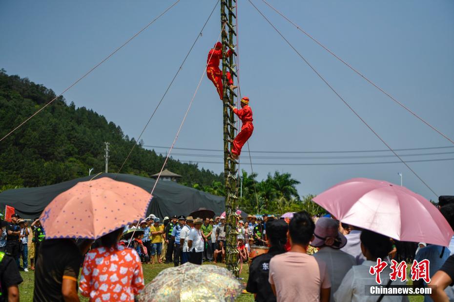 海南民眾鬧軍坡上演“上刀山”驚險(xiǎn)驚心引民眾駐足觀看