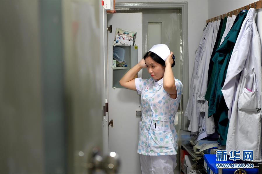在江西省人民醫(yī)院兒科,高麗萍換上工作服準(zhǔn)備進入新生兒監(jiān)護室工作(5月11日攝)。