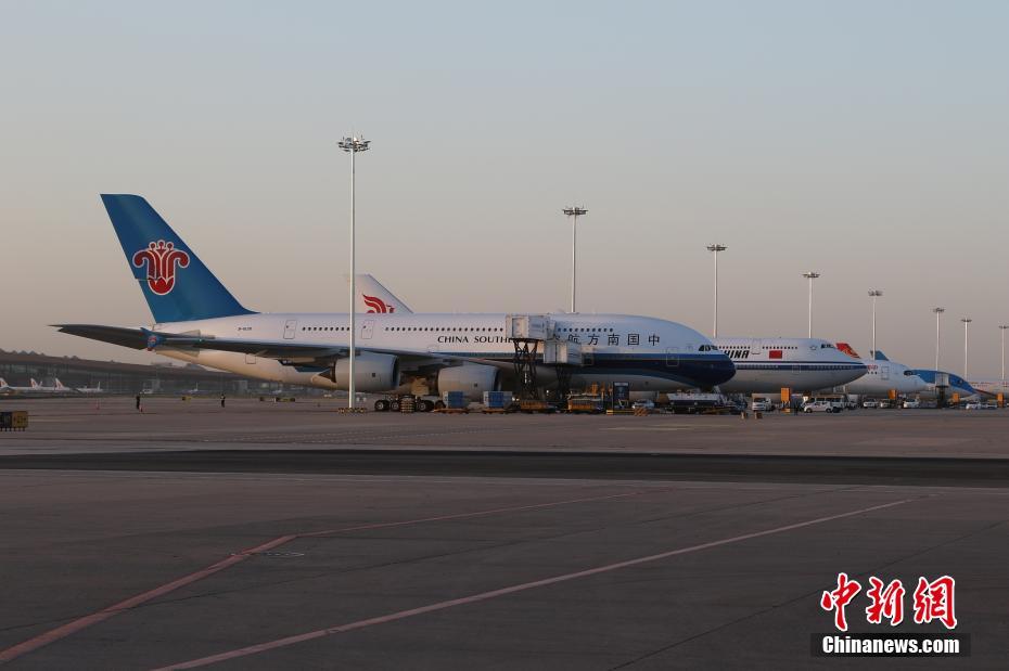 2019年5月13日清晨,北京首都機(jī)場(chǎng)內(nèi),即將飛赴大興機(jī)場(chǎng)的四架飛機(jī)。今天,北京大興國(guó)際機(jī)場(chǎng)開(kāi)展試飛工作。參與此次試飛的航空公司為南航、東航、國(guó)航和廈航,并將分別選派A380、A350-900、B747-8、B787-9機(jī)型飛機(jī)執(zhí)行試飛任務(wù)。預(yù)計(jì)上午9點(diǎn),第一架試飛飛機(jī)從首都機(jī)場(chǎng)起飛;約9點(diǎn)半,第一架飛機(jī)落地大興機(jī)場(chǎng)。