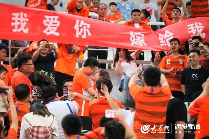 大眾網(wǎng)·海報(bào)新聞5月26日濟(jì)南訊(記者 亓翔)今晚在山東魯能主場(chǎng)迎戰(zhàn)廣州富力的中超賽場(chǎng)上上演了浪漫一幕,在比賽中場(chǎng)休息時(shí),看臺(tái)上的一名魯能球迷突然拿出了鮮花和戒指向自己的女友求婚,同行的球迷還拉起了橫幅:"我愛你,嫁給我吧",最終他的女友欣然接受了求婚,在場(chǎng)的球迷共同為他們見證了這一時(shí)刻。
