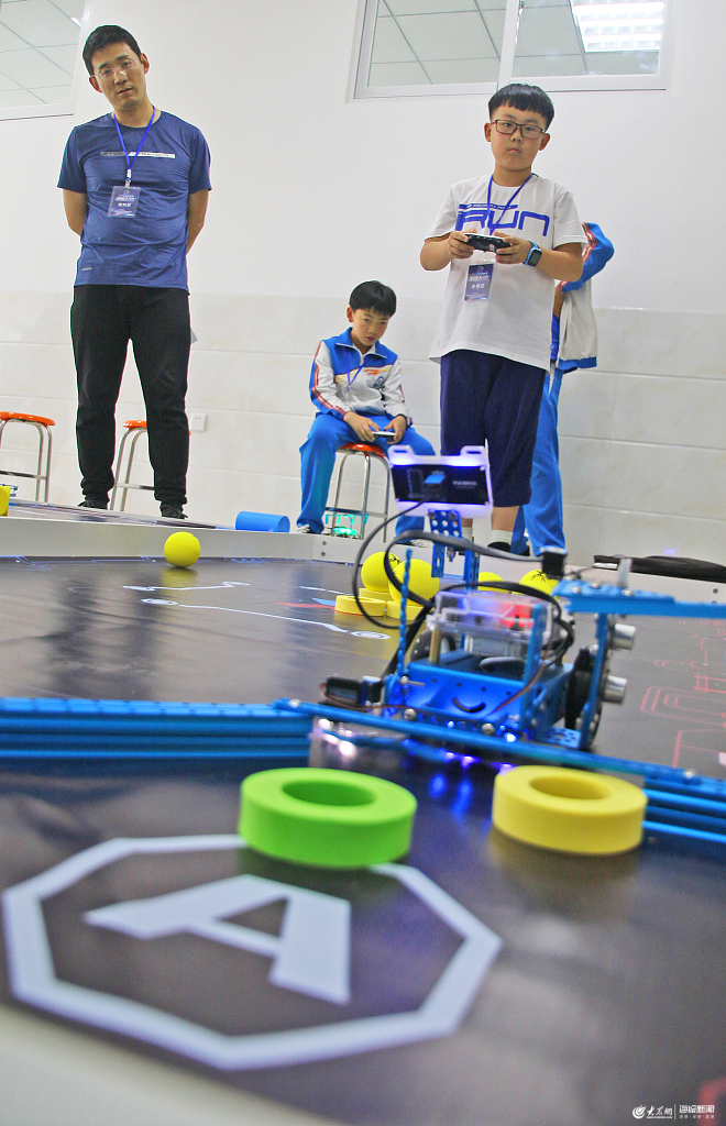 2019年5月26日,在山東省煙臺(tái)市中小學(xué)機(jī)器人競(jìng)賽上,小選手進(jìn)行MakeX機(jī)器人挑戰(zhàn)賽。