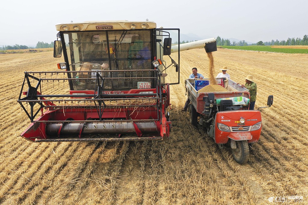 2019年6月1日,山東青島西海岸新區(qū)王臺鎮(zhèn)徐村迎來了小麥豐收季,村里的農(nóng)民一大早便在麥田里用聯(lián)合收割機(jī)搶收金燦燦的小麥,確保夏糧顆粒歸倉。