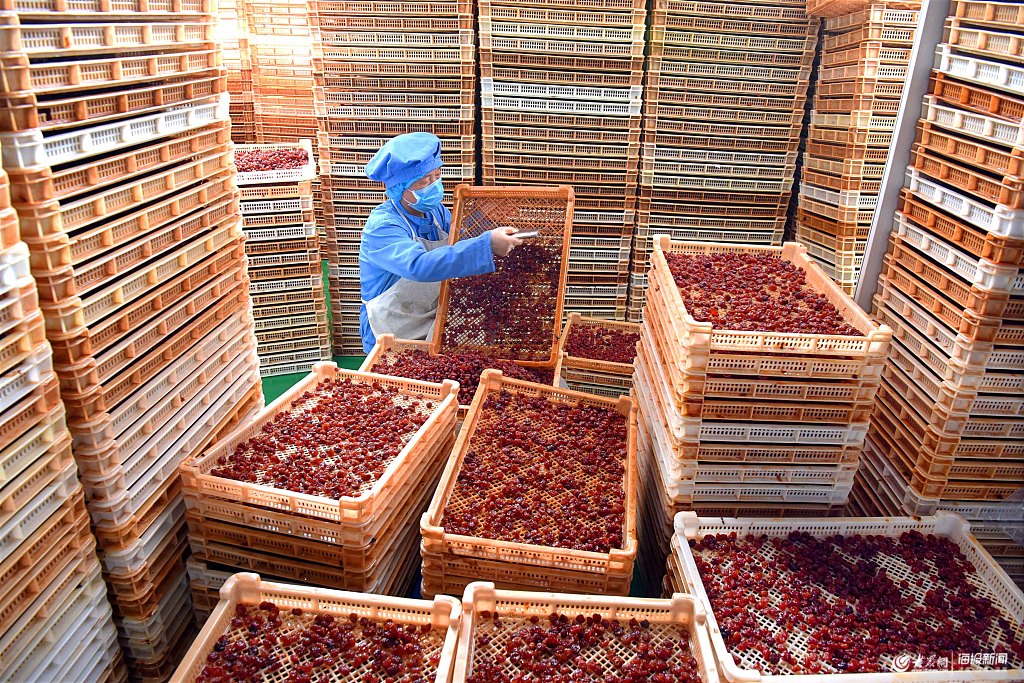2019年6月3日,在山東省淄博市沂源縣悅莊鎮(zhèn)一果品加工企業(yè),工人在加工大櫻桃。