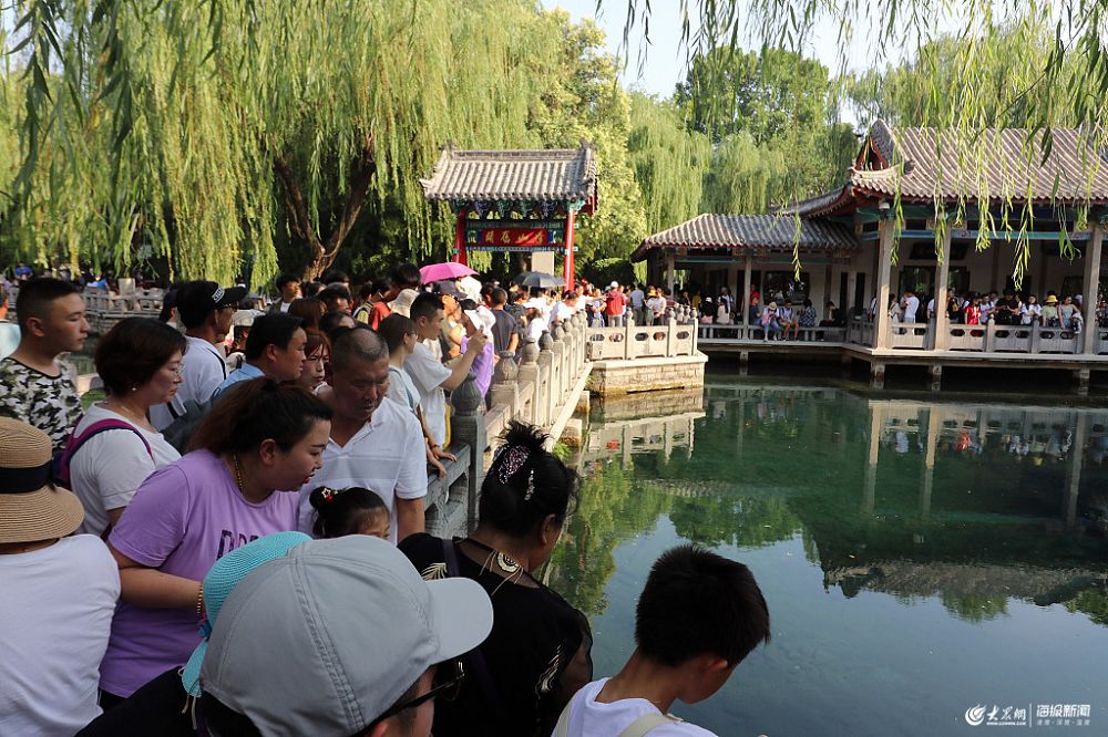 2019年6月8日,濟南,端午假期,趵突泉景區(qū)內游客扎堆,游客在樹蔭、涼亭、水池邊納涼玩水賞景。