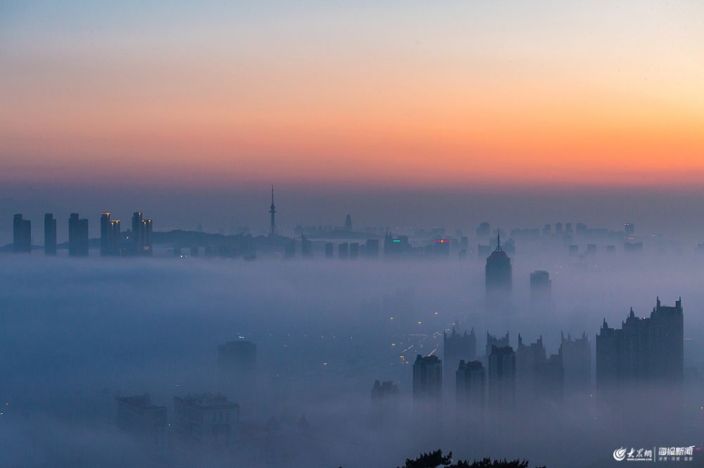 6月10日,日落時分,浮山上俯瞰青島,城區(qū)出現(xiàn)平流霧景觀。路鵬宇 攝 圖片來源:視覺中國