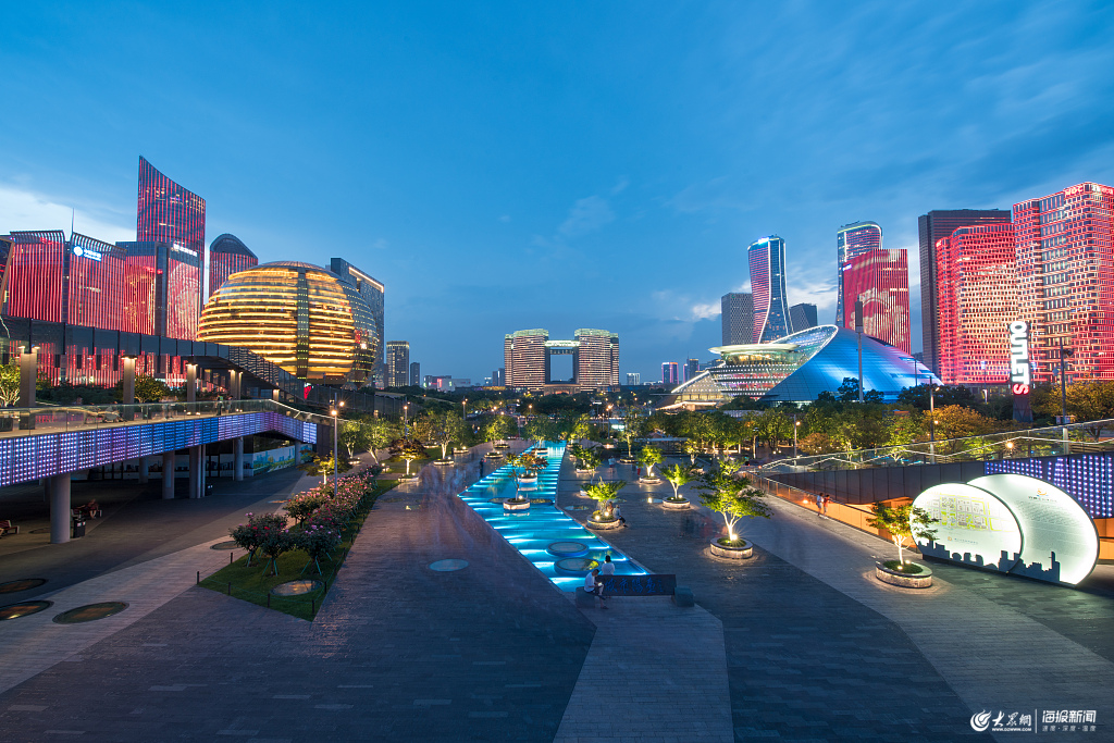 錢江新城燈光秀開始,現(xiàn)代建筑上出現(xiàn)中國元素的燈光秀。
