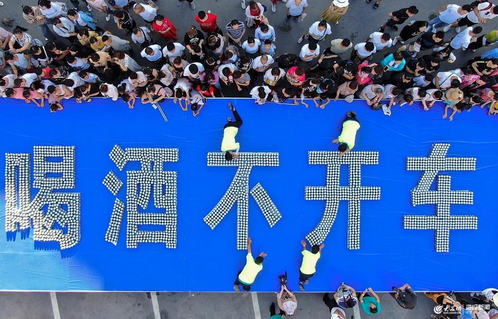 7月6日傍晚,河南洛陽重渡溝舉行千人酒王爭霸賽,吸引上千人參與角逐拼酒王拿大獎,各個選手斗志昂揚,喝啤酒大戰(zhàn)一觸即發(fā),在斗酒開始之前,現(xiàn)場的司機們卻和交警一起,來到有數(shù)千個易拉罐啤酒拼成的“喝酒不開車”的警示語前,面對自己的家人,跟著交警向家人立誓“為了自己家人和他人的幸福,遵守交通法規(guī),喝酒不開車”。