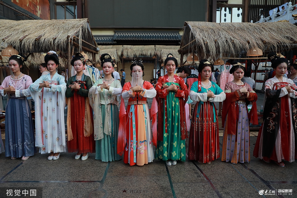 2019年7月27日,西安,在《長(zhǎng)安十二時(shí)辰》帶火的大唐西市,一群穿著傳統(tǒng)漢服的青春帥男美女,冒著酷熱表演傳統(tǒng)禮儀和舞蹈,還乘坐電梯在唐風(fēng)古韻的西市風(fēng)情街悠閑逛游,恍若穿越時(shí)空。原來是這群漢服愛好者在這里開辦的“唐隱市”平臺(tái)里,以漢服這一傳統(tǒng)文化元素,讓更多民眾和游客了解漢服,傳承文化。