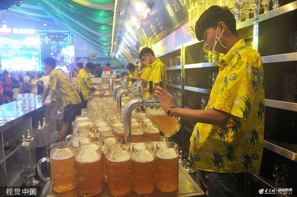 2019年7月28日,第29屆青島國際啤酒節(jié)進入第三天,越來越多的中外游客進入位于海邊的青島金沙灘啤酒城游玩、喝啤酒、狂歡,盛夏的夜晚整個海岸充滿啤酒的醇香和歡樂。
