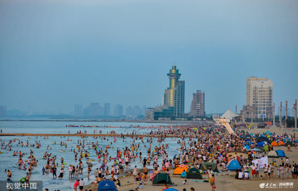 山東煙臺(tái):高溫持續(xù)人流大量涌入海濱浴場(chǎng)
