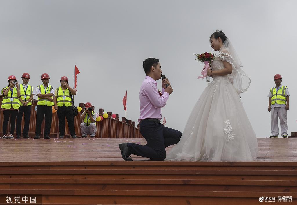 2019年8月2日,山東濱州,一對(duì)新人在工地舉行婚禮。
