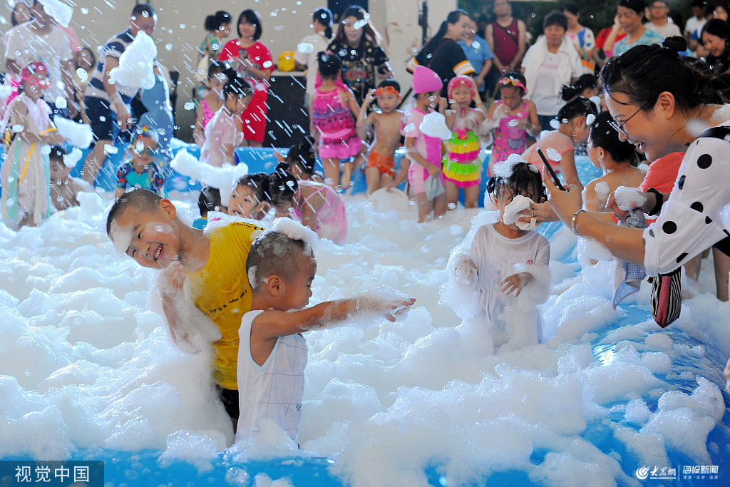2019年8月3日,浙江金華,當天傍晚,在市西市街一百貨商場七樓空中花園里,一場親子泡沫浴趣味派對激情上演,百余萌娃與各自家長在“泳池”中的泡泡堆里打水仗、捉泥鰍,飛舞的泡泡讓現場嗨翻天。