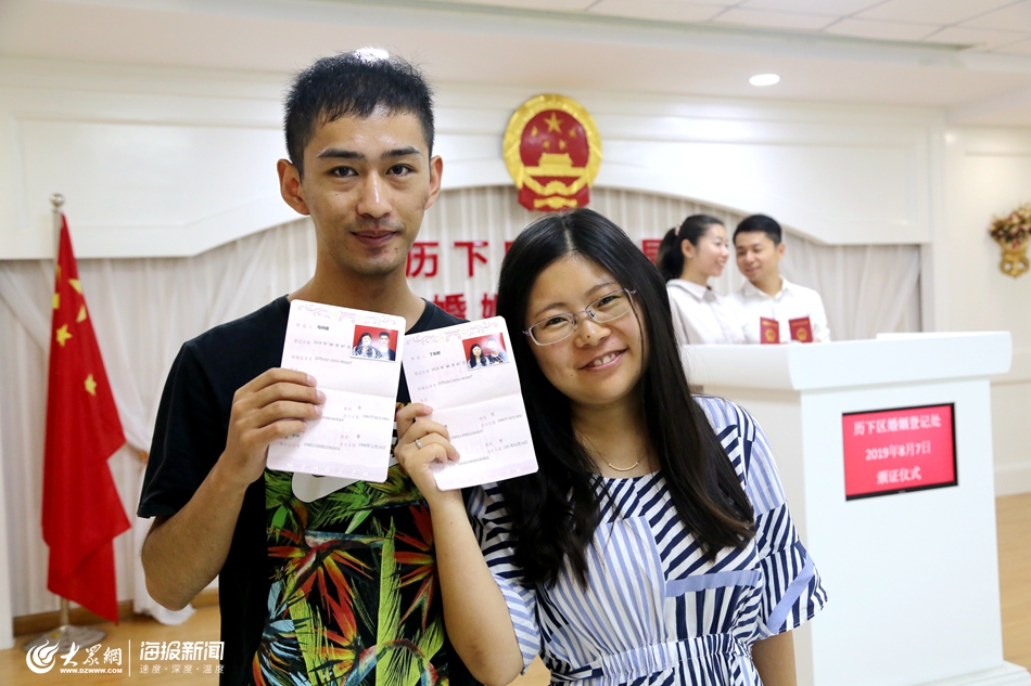 大眾網(wǎng)·海報(bào)新聞濟(jì)南8月7日訊(記者 儀首歌 李金珊 實(shí)習(xí)生 葛曉月)七夕是中國一年一度的傳統(tǒng)情人節(jié)。一大早,記者來到位于二環(huán)東路的歷下區(qū)婚姻登記處。雖然下著小雨,但仍然擋不住一對對情侶結(jié)發(fā)為夫妻的決心,早上8點(diǎn),歷下區(qū)婚姻登記處的門口就排起了長隊(duì),都想在這個(gè)美好的日子里,拿到幸福的號碼牌;橐龅怯洿髲d熙熙攘攘,每對情侶的臉上都洋溢著幸福的笑,已經(jīng)拿到結(jié)婚證的夫妻,周圍仿佛都冒著粉紅色的幸福泡泡。
