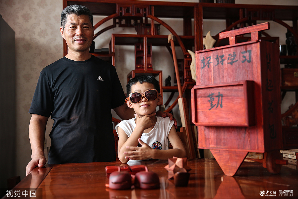 2019年7月18日,河北滄州。李春強(qiáng),今年49歲,是河北省河間市故仙鄉(xiāng)西留莊村的一名木匠。隨著現(xiàn)代機(jī)械化的普及,越來越多的木工手藝日漸消失。為了能留住老祖宗們傳下來的技藝,李春強(qiáng)一家三代人重新拾起了木工手藝,繼續(xù)傳承下去。今年,李春強(qiáng)為獎勵期末考試第一名的孫子,特意為他制作了一個(gè)紅花梨木的拉桿書包!跋M畔率謾C(jī),背起書包,好好學(xué)習(xí)!币曨l上傳網(wǎng)絡(luò)后,迅速走紅,李春強(qiáng)被網(wǎng)友們稱為“硬核爺爺”。圖片作者:王偉倩/視覺中國