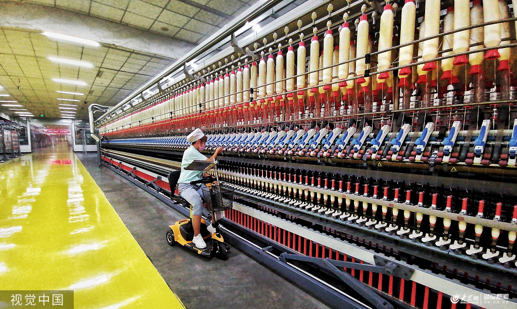 2019年8月22日,在山東援疆的喀什地區(qū)疏勒縣如意科技紡織有限公司緊密紡細(xì)紗車間里,維吾爾族女值車工開著智能電動(dòng)車,根據(jù)apid顯示的斷頭信息,合理規(guī)劃巡回路線,大大提高了擋車的效率。錢捍/視覺中國