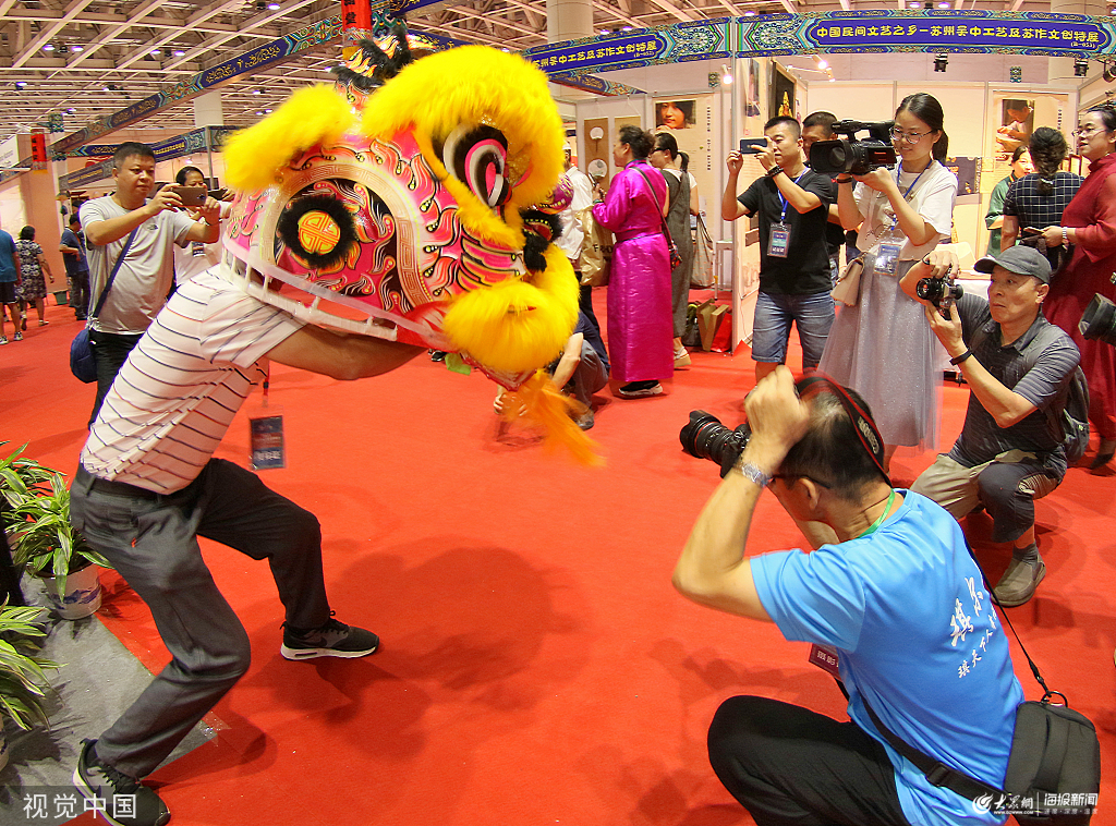 2019年8月23日,山東煙臺(tái),在2019中國(guó)民間工藝品博覽會(huì)上,民間藝術(shù)家李榮仔在展示遂溪醒獅。