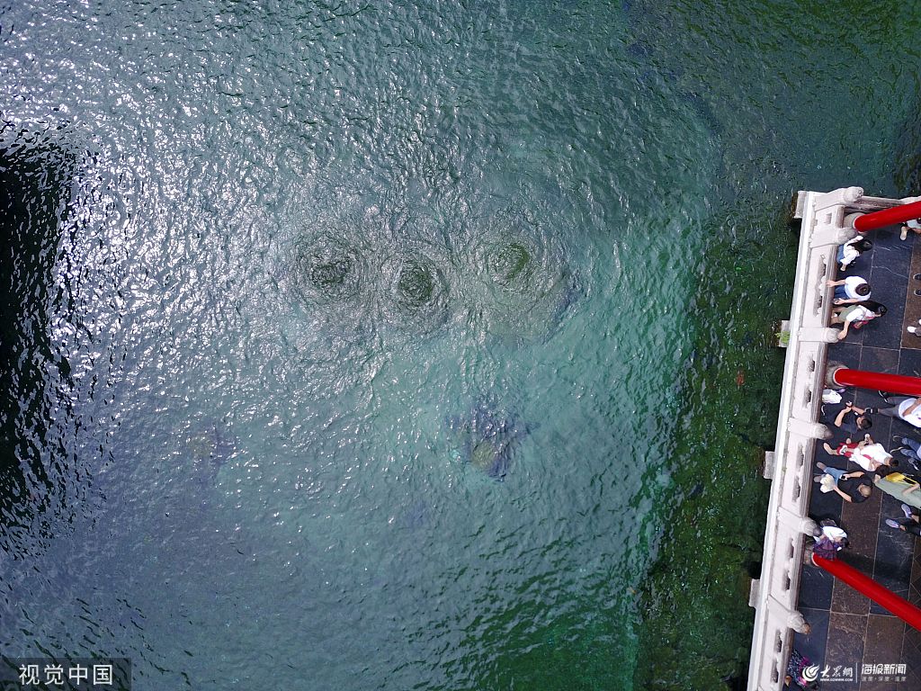 2019年9月3日,初秋季節(jié),濟南趵突泉黑虎泉迎來了最美的季節(jié)。航拍趵突泉噴涌實景。