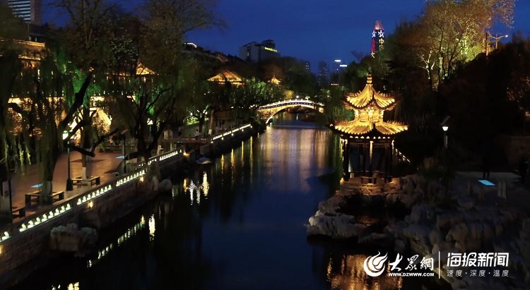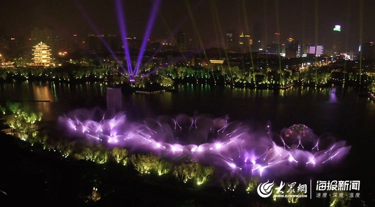 燈光亮起,泉城廣場噴泉隨音樂舞動