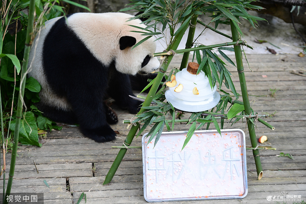 2019年9月13日,貴陽,黔靈山公園管理處聯(lián)合貴州省野生動植物保護(hù)協(xié)會舉辦“親近自然保護(hù)大熊貓~滾滾中秋月”主題活動。圖為熊貓從臥室出來到活動場地吃月餅。