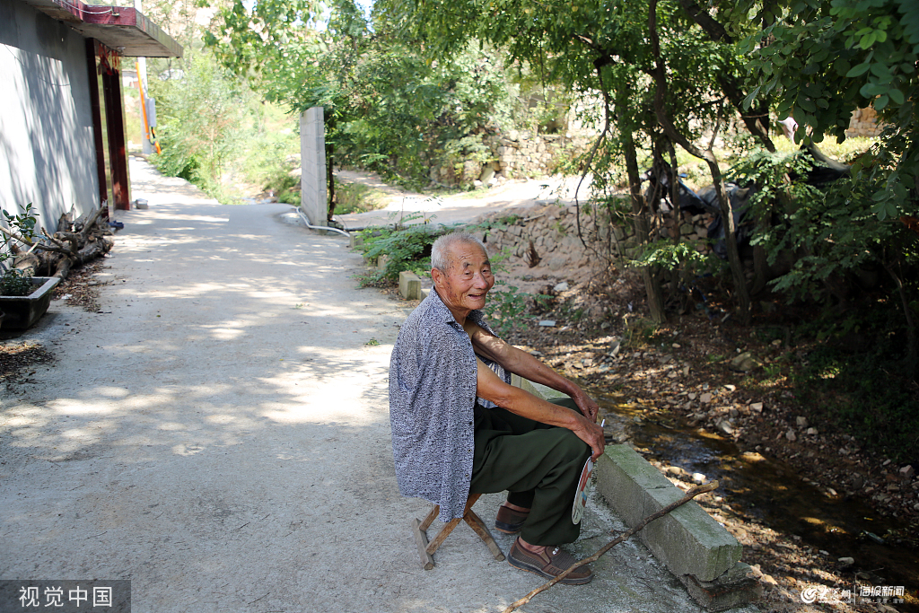 2019年9月5日至14日,在山東省日照市南湖鎮(zhèn)獅子嶺村,剛剛睡過午覺得鄭培合老人,坐在馬扎上乘涼。在他的南側,一條小溪流緩緩的自東向西流過,溪水清澈,岸邊的大槐樹枝繁葉茂,形成很大的樹蔭,一陣微風吹過,偶有幾片樹葉飄灑下來。