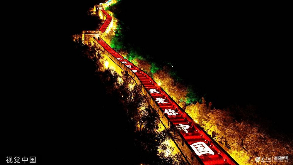 2019年9月27日晚,北京,在中華人民共和國(guó)成立70周年之際,雄偉的八達(dá)嶺長(zhǎng)城點(diǎn)亮燈光秀。夜幕下的八達(dá)嶺長(zhǎng)城古老蒼勁,在燈光的映照下仿佛一條巨龍飛舞群山之間!白鎳(guó)萬(wàn)歲”“我愛(ài)你中國(guó)”9個(gè)金色大字逐一顯現(xiàn),表達(dá)對(duì)新中國(guó)成立70周年的祝福。