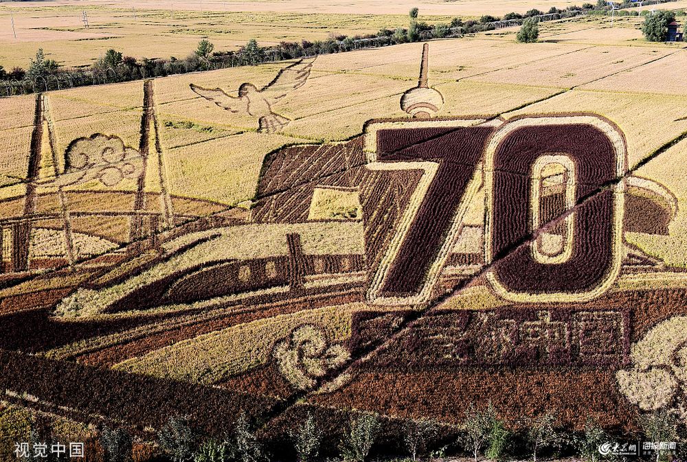 2019年9月25日、27日,沈陽,沈北新區(qū)金黃的“3D稻田畫”進入收獲期,喜迎新中國成立70周年。