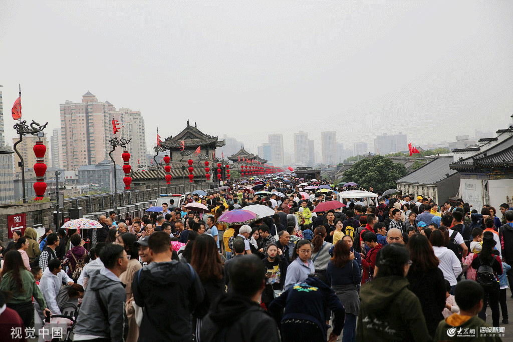 10月4日,十一黃金周第四天,西安下起了雨,游客撐傘冒雨游覽西安城墻。