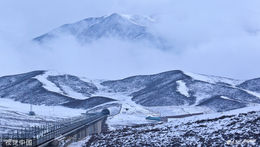 2019年10月6日,甘肅張掖,祁連山麓迎來降雪,雪后的祁連山群迤邐,銀裝素裹,積雪覆蓋了山下的草原,蘭新高鐵在壯麗的祁連山中馳騁,美不勝收。