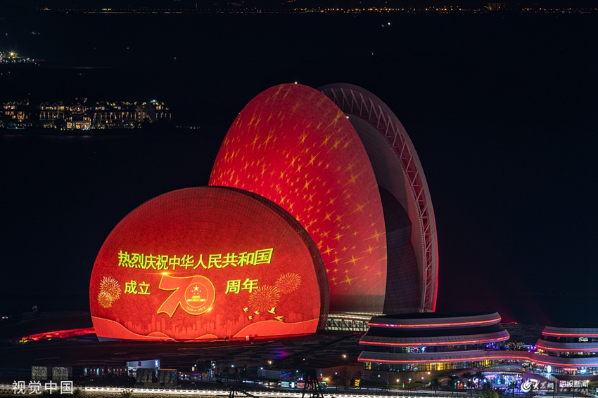 2019年10月5日,廣東珠海大劇院上演國(guó)慶版燈光秀,慶祝新中國(guó)成立70周年。每晚8點(diǎn)整,坐落在情侶灣畔的大小貝殼準(zhǔn)時(shí)啟亮,抬頭所見(jiàn),國(guó)旗、國(guó)徽、70周年標(biāo)識(shí)映襯在巨大的貝殼上,此外,一組珠海建市四十年發(fā)展組圖亦格外引人注目。燈光秀將伴隨著整個(gè)國(guó)慶假期,給本了市民及外地游客提供一個(gè)休閑娛樂(lè)的好去處。