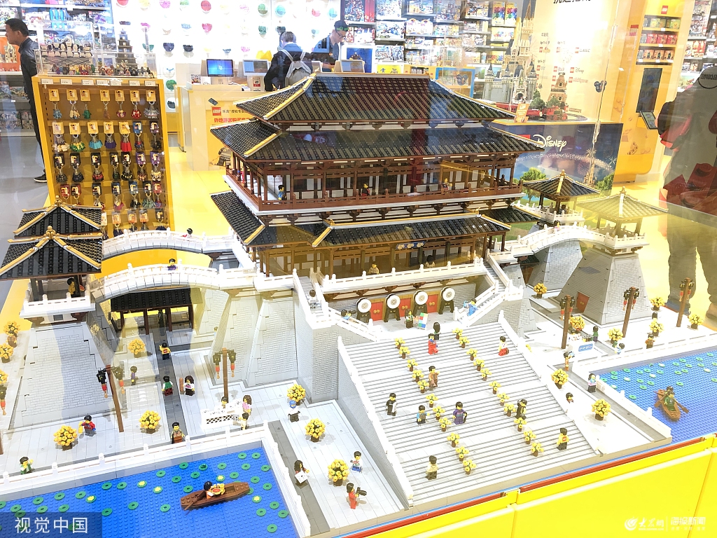 一座由14萬顆積木拼成的大唐芙蓉園紫云閣造型,吸引眾多“樂高迷”前來觀看。