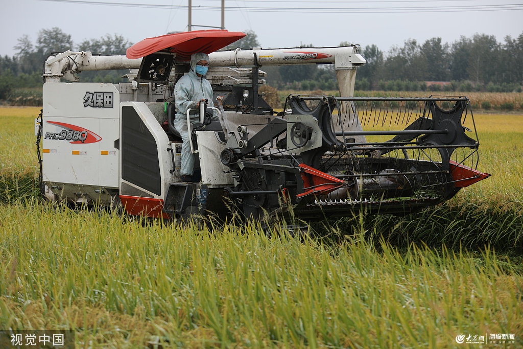 山東日照,在莒縣閆莊鎮(zhèn)張家當(dāng)門村,稻田中收割機發(fā)出隆隆聲,農(nóng)民正在搶收稻谷,豐收的喜悅彌漫著淡淡的稻香,農(nóng)民載歌載舞,歡歡喜喜慶豐收。