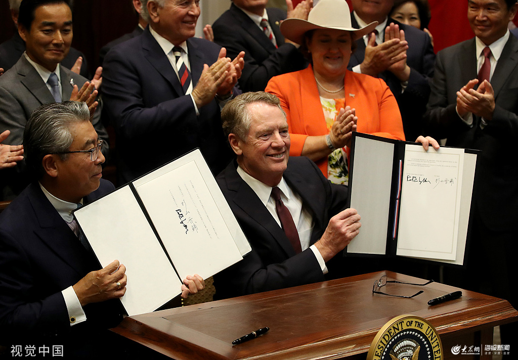 當(dāng)?shù)貢r間2019年10月7日,美國華盛頓,日駐美大使杉山晉輔和美國通商代表部代表羅伯特·萊特希澤在白宮正式簽署一份新的貿(mào)易協(xié)議,美總統(tǒng)特朗普也參加了這次簽字儀式,并在會上發(fā)言。特朗普在儀式上說:“這項協(xié)議將大幅削減美國的貿(mào)易赤字,為經(jīng)濟(jì)增長帶來最好的機(jī)會。對農(nóng)民和牧場主來說,這是一個很大的轉(zhuǎn)折點!比彰椒Q,美方希望這項協(xié)議能在2020年1月1日生效,協(xié)議的內(nèi)容包括要求日本降低對美農(nóng)產(chǎn)品的關(guān)稅等。