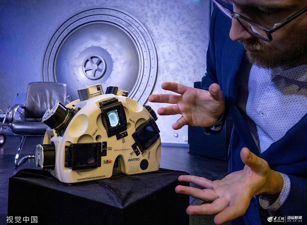 當(dāng)?shù)貢r(shí)間2019年10月9日,俄羅斯莫斯科,Bioprinting Solutions公司在新聞發(fā)布會(huì)上展示了3D生物打印技術(shù),該技術(shù)旨在利用微重力環(huán)境下的磁場(chǎng)創(chuàng)造牛肉、兔子和魚(yú)的組織。