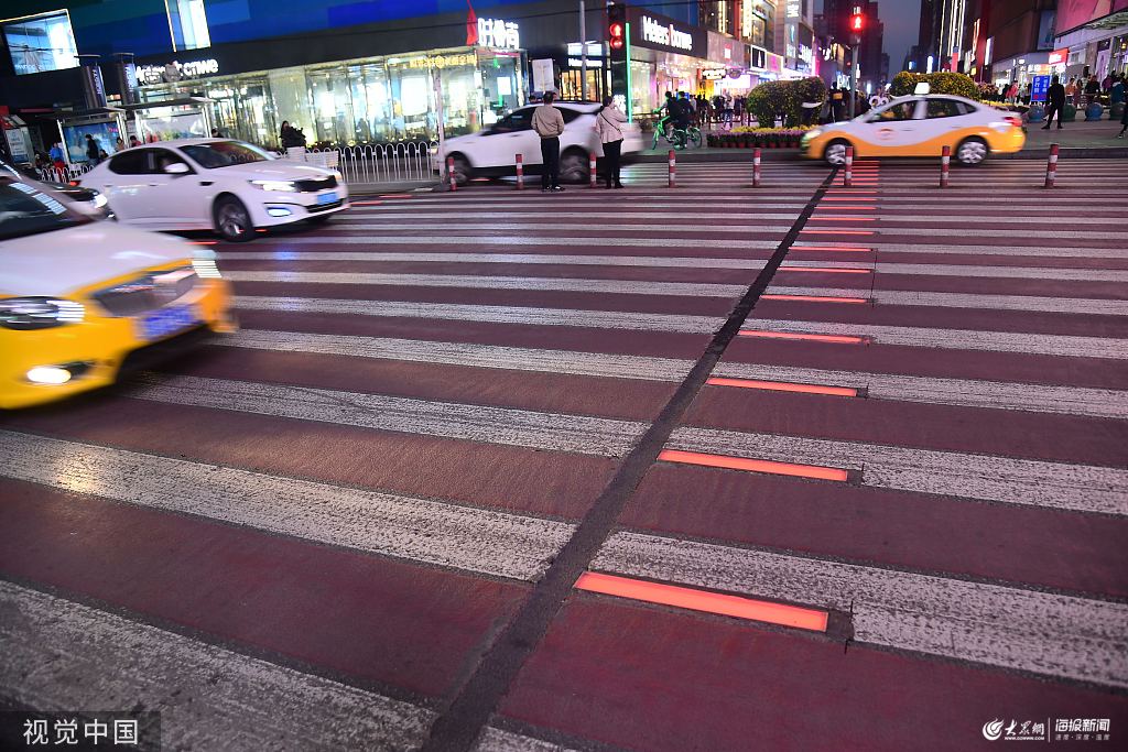 2019年10月10日,沈陽,位于中華路與太原街交會處的斑馬線,隨著交通信號燈的變換,閃爍起紅、黃、綠的顏色,在夜幕下格外醒目。