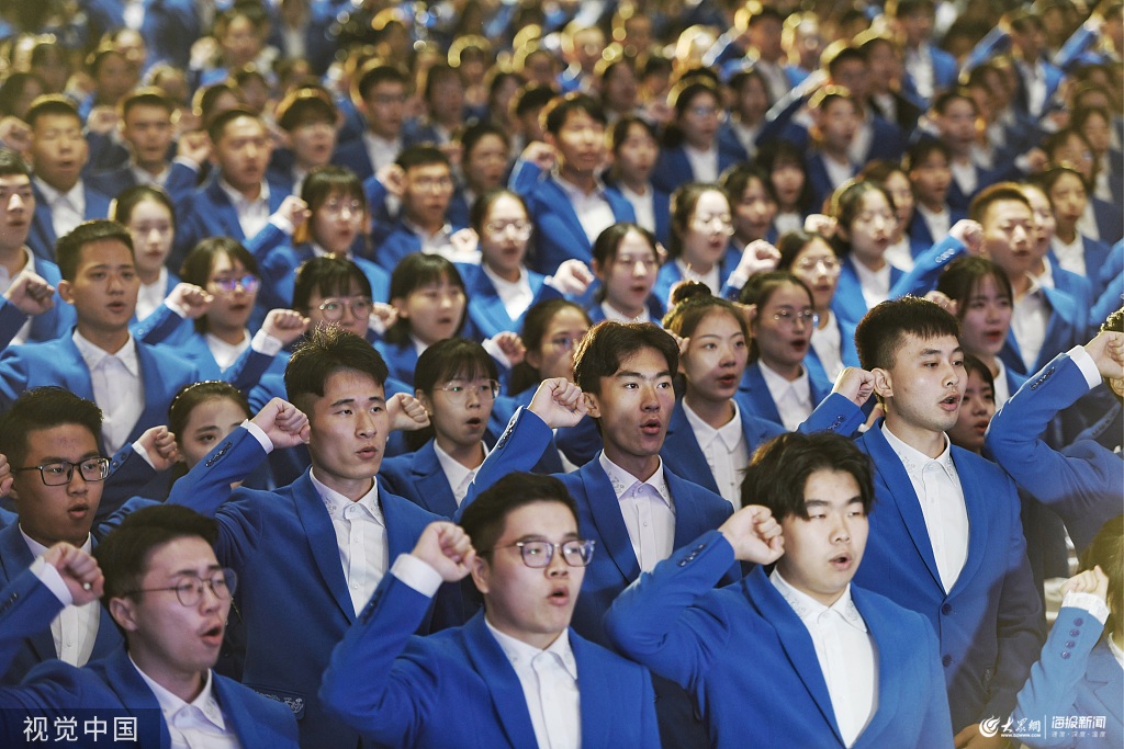 2019年10月13日,浙江嘉興,第六屆世界互聯(lián)網(wǎng)大會(huì)志愿者在浙江桐鄉(xiāng)技師學(xué)院舉行出征儀式,1000名“小梧桐”宣誓呼號(hào)。儀式上還發(fā)布及展示了志愿者服裝、志愿匯智能指揮系統(tǒng)。
