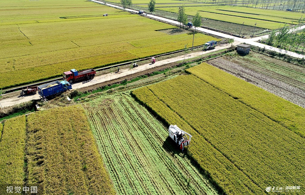 2019年10月15日,山東臨沂,郯城縣洪偉農(nóng)機(jī)化服務(wù)農(nóng)民專業(yè)合作社農(nóng)機(jī)手駕駛收割機(jī)收獲“股份水稻”(無(wú)人機(jī)拍攝)。