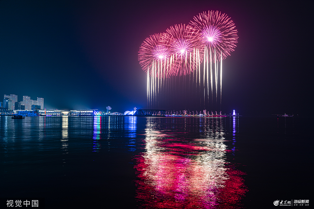 2019年10月18日,青島,為迎接跨國公司領(lǐng)導(dǎo)人青島峰會(huì),青島奧林匹克帆船中心情人壩舉辦焰火表演。