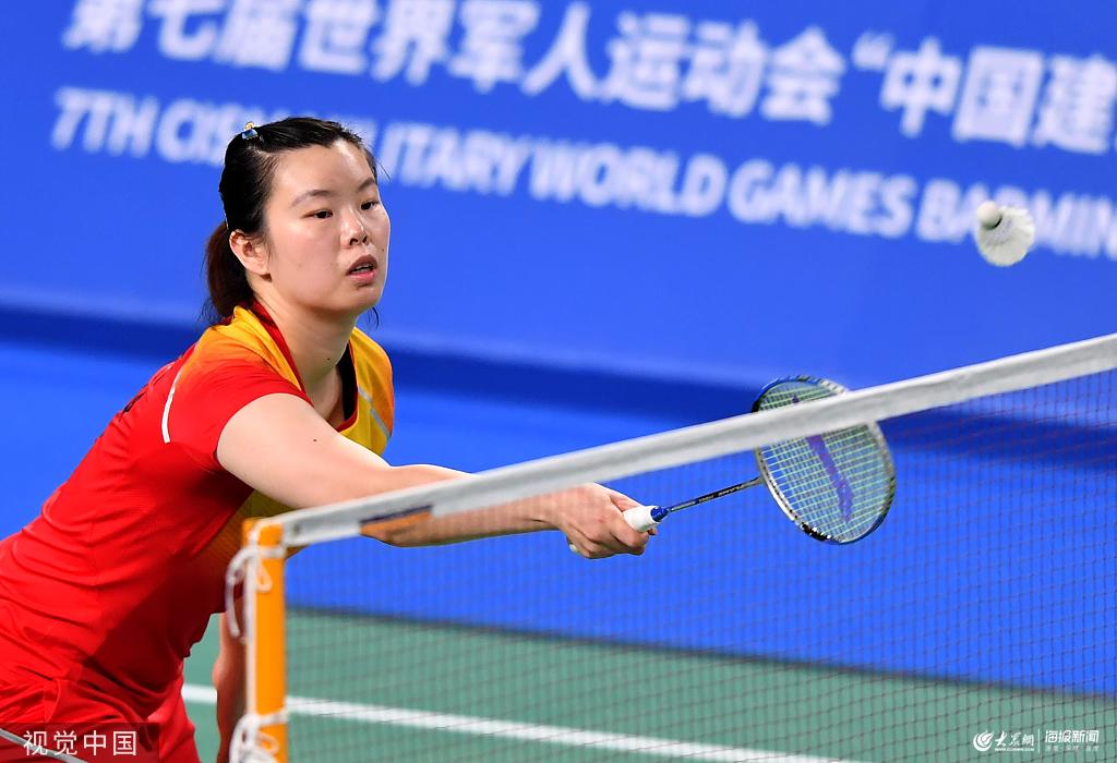 10月23日,湖北武漢,第七屆世界軍人運動會羽毛球混雙項目開賽。中國選手、奧運冠軍李雪芮和張楠輕松戰(zhàn)勝小組賽首個對手法國組合晉級。圖為李雪芮在比賽中。